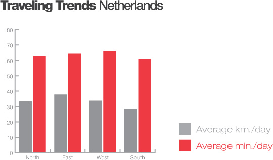 9.25 million motor vehicles travel regularly around The Netherlands every day. 76% of the Dutch population commutes on average one hour/day for 37.5 kilometers.